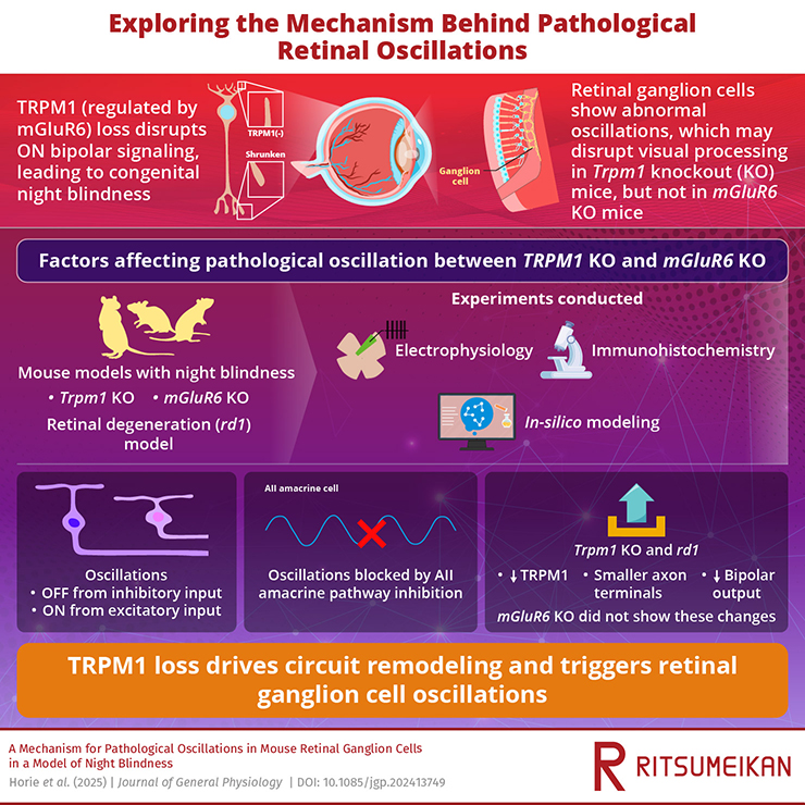 In a recent study published online in The Journal of General Physiology on October 16, 2025, led by Mr. Sho Horie, a PhD candidate, from the Graduate School of Pharmacy, Ritsumeikan University, Japan, along with Professor Katsunori Kitano, Professor Masao Tachibana, and Professor Chieko Koike, from Center for Systems Vision Science, Ritsumeikan University, revealed that the loss of a single ion channel—TRPM1—sets off a cascade of changes that lead to persistent oscillations in the retina. Their findings not only illuminate the cellular basis of CSNB but also identify a common mechanism underlying retinal degenerative conditions, such as RP.