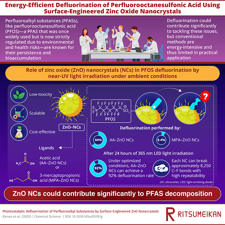 A new study, led by Professor Yoichi Kobayashi from Ritsumeikan University, Japan, with Mr. Shuhei Kanao also from the same university, explored the possibility of using zinc oxide (ZnO) nanocrystals (NCs) in the PFAS-defluorination process. NCs, known for their photocatalytic properties, can use light to generate reactive species that degrade organic pollutants. NCs capped with different ligands were used for their enhanced efficiency. “Perfluorooctanesulfonic acid or PFOS is a PFAS compound that was once widely used but is now strictly regulated, and we wanted to see if ligand-capped ZnO NCs can defluorinate it,” mentioned Prof. Kobayashi. This study was published online in Chemical Science on November 5, 2025.
