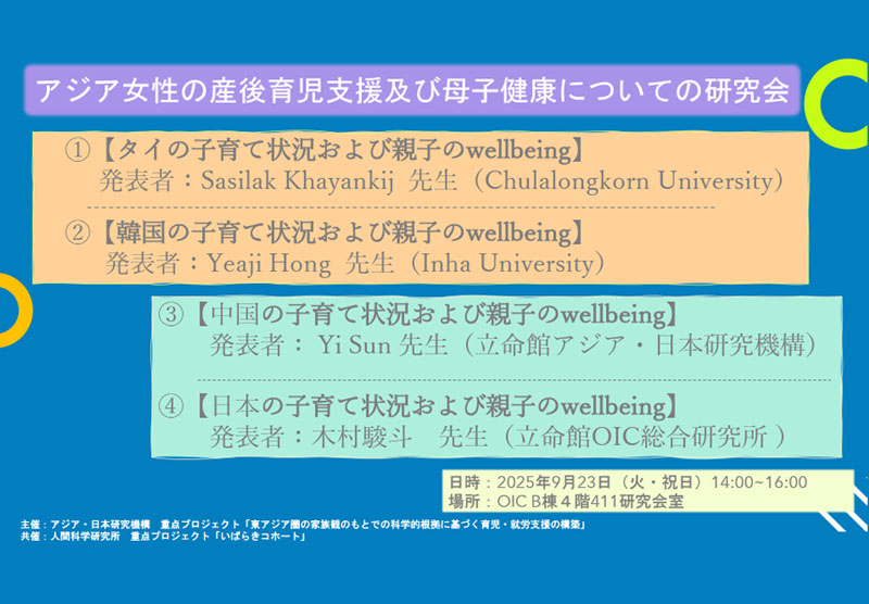 【9/23 Tue】AJI Research Institute Priority Program: A workshop on “Postpartum Childcare Support and Maternal and Child Health in Asia” (Project Leader: Prof. Yuko Yato)