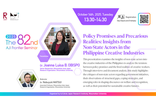 【10/14(火)】The 82nd AJI Frontier Seminar will be held! Dr. Joanna Luisa B. OBISPO, “Policy Promises and Precarious Realities: Insights from Non-State Actors in the Philippine Creative Industries”