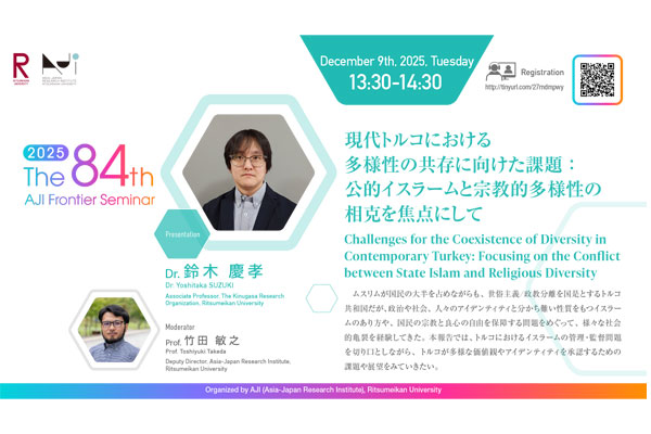 【12/9 Tue】The 84th AJI Frontier Seminar will be held! Dr. Yoshitaka SUZUKI, “Challenges for the Coexistence of Diversity in Contemporary Turkey: Focusing on the Conflict between State Islam and Religious Diversity”