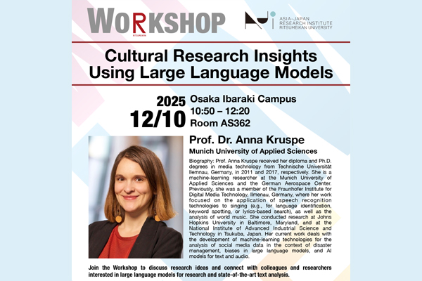 【12/10 Wed】International workshop, “Cultural Research Insights Using LLM” by Prof. Anna Kruspe), will be held! (Asia-Japan Research Development Progra