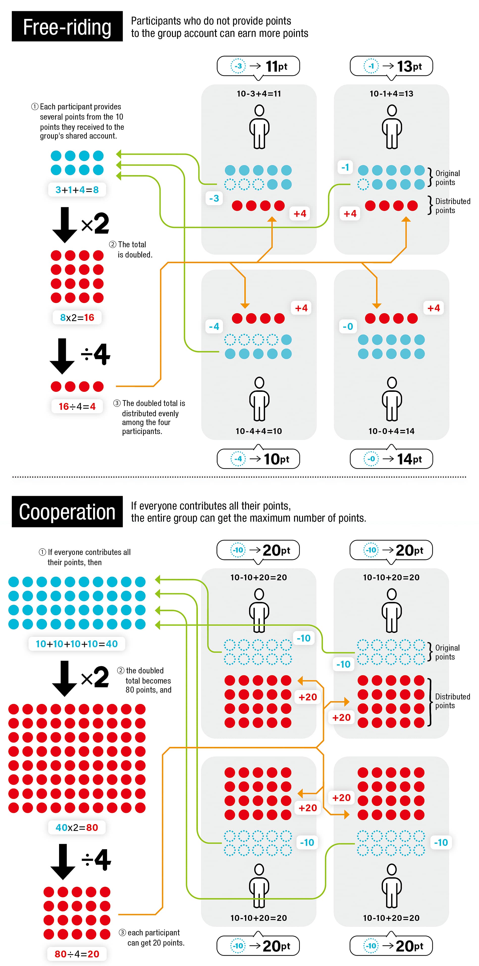 Groups of four are formed, and each participant is given ten points. Each participant then has to decide how many of those ten points they will contribute to the group account. Any points they do not contribute remain their own, but the total points contributed to the group account are doubled. That doubled total is then divided equally among the four participants. This creates a dilemma: individuals who contribute nothing (free-riders) can sometimes come away with more points than those who cooperated; however, if everyone contributes all ten points, each participant will receive twenty points—more than they would gain if no one contributed anything. This raises the question of how to encourage the participants to contribute more in these kinds of situations.